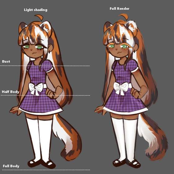 Full body = A character drawn with their entire body.Light Shading = Minimal shading, no rendering.